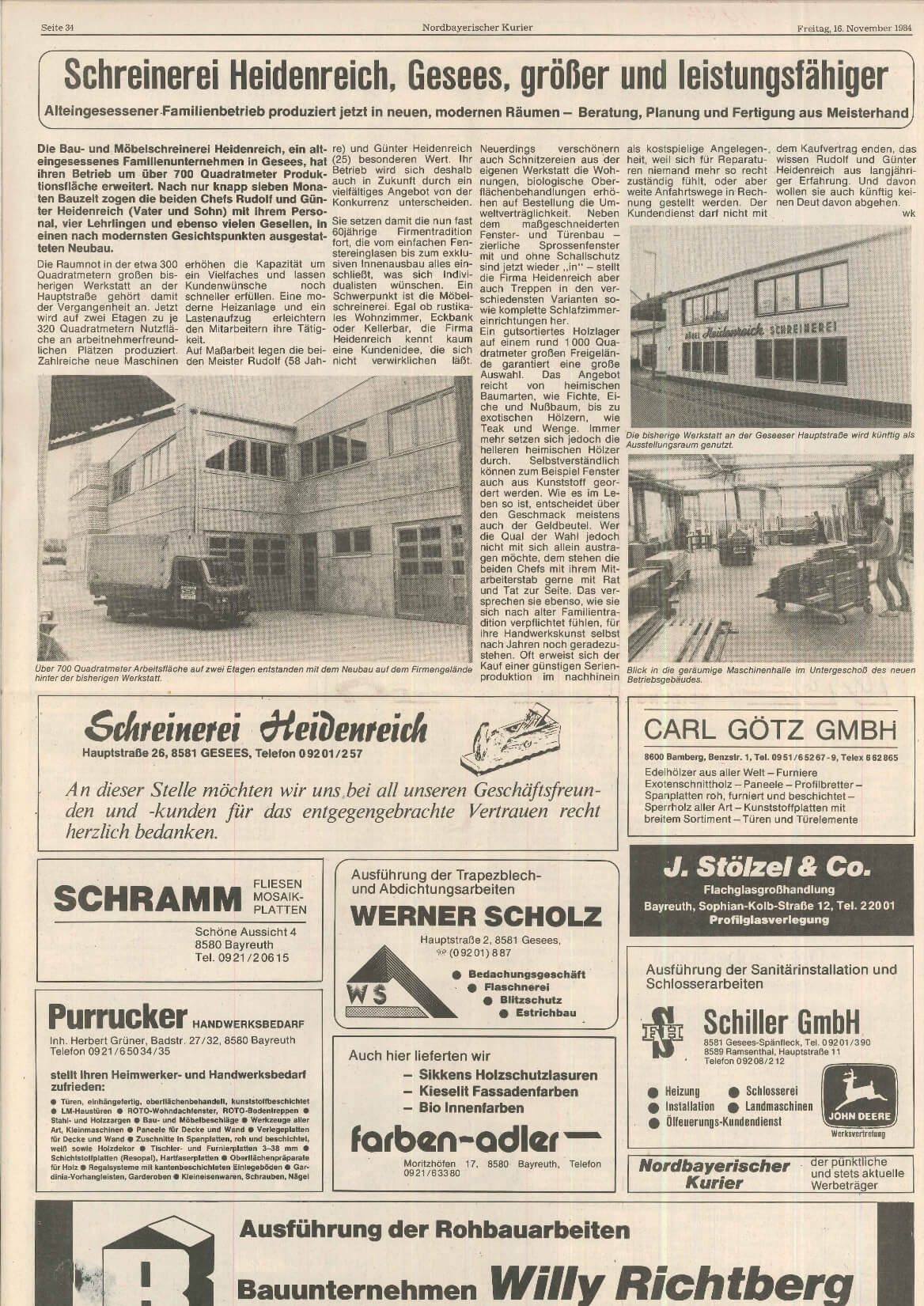Als Georg Heidenreich im Jahr 1925 in Gesees die Schreinerei Heidenreich gründete war die Welt inmitten einer Wirtschaftskrise, selbst Fußgänger lebten noch gefährlich, denn in Deutschland wurde erst 1924 die erste leuchtende Ampel (am Potsdamer Platz in Berlin) errichtet.